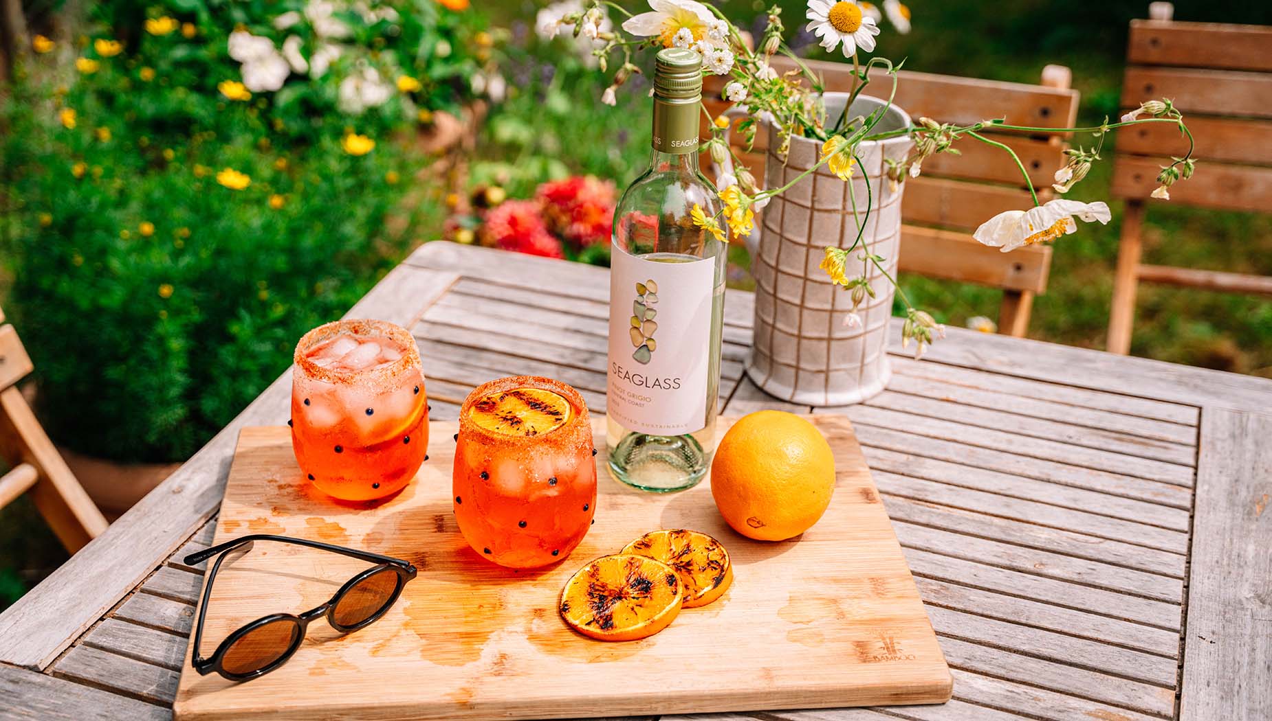 - 4. Add ice to glasses. Pour in Aperol, SEAGLASS Pinot Grigio, and top with your grilled orange slices.